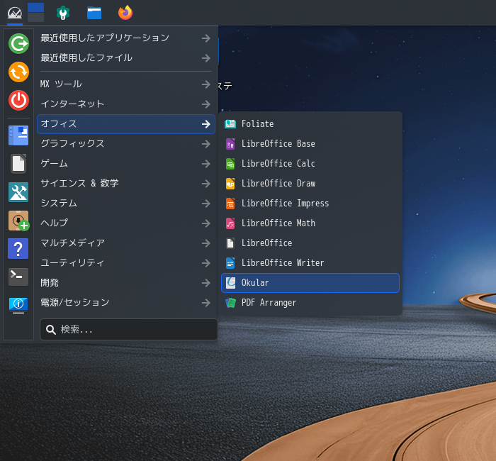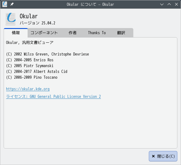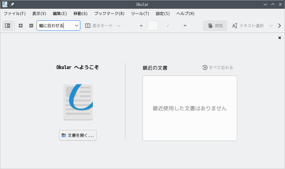 1. 概要 ドキュメントビューアとして、「Okular」を使用します。 「Okular」は、デフォルトでインストールされています。 2. 起動 「スタート」→「オフィス」→「Okular」 メニュー上で、ひとつ下に、「PDF Arranger」というのがあって、これは、編集できるのかしら? いささか気になります。