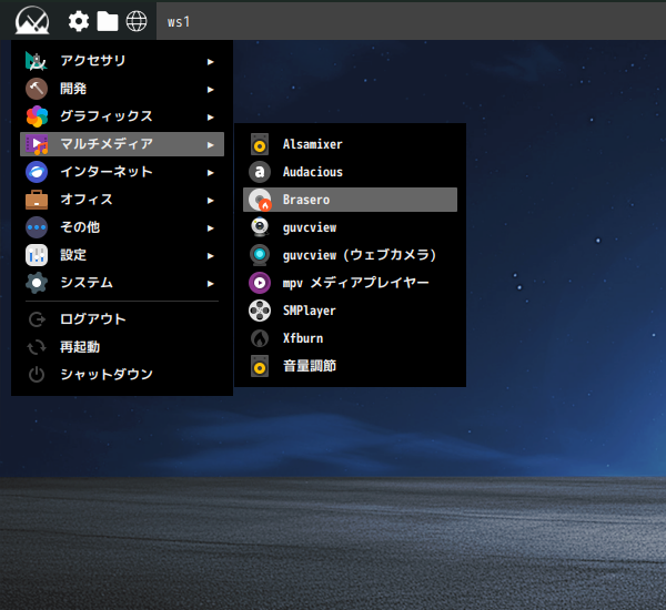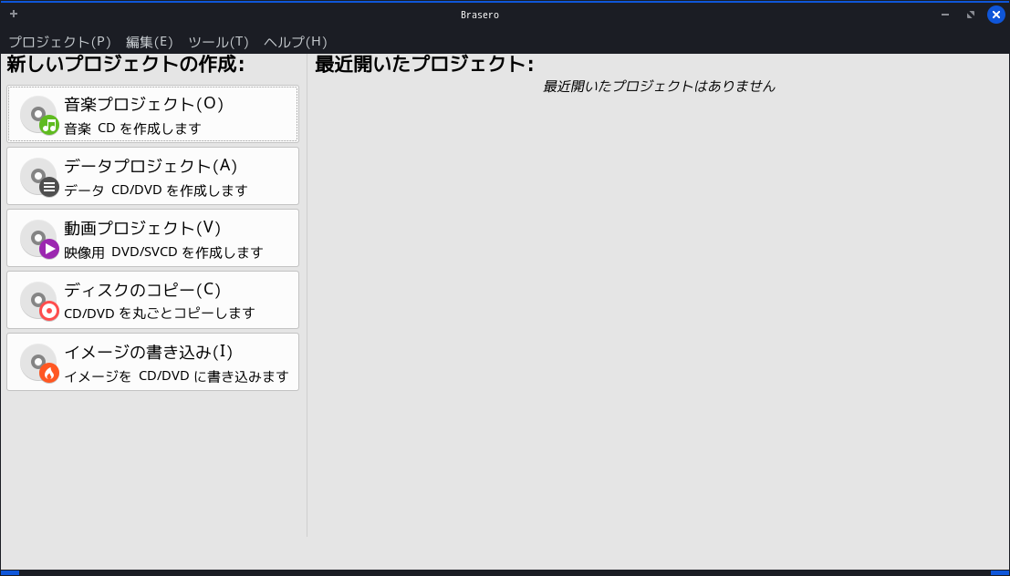 1. 概要 光ディスク(CD・DVD)のライティングソフトとして、「Brasero」を使用します。 2. インストール 「Synaptic」で、「brasero」を検索して、インストールします。 3. 起動 「スタート」→「マルチメディア」→「Brasero」