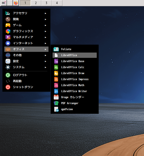 オフィススイートとして、「LibreOffice」がデフォルトでインストールされていますが、日本語化されていません。