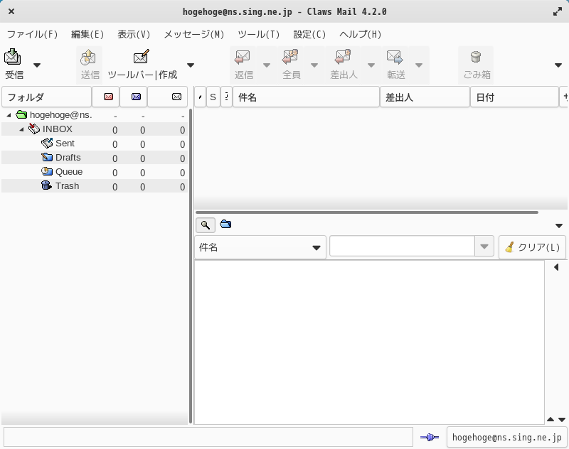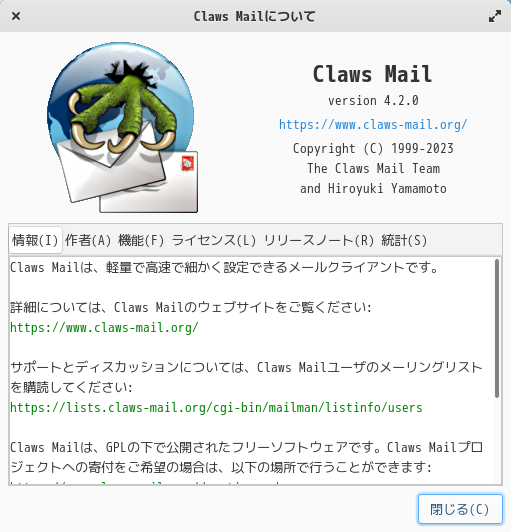 初回起動時は「設定ウィザード」から始まります。 起動直後の状態です。 2024年11月28日の時点で、下記のバージョンでした。 「設定ウィザード」他、操作方法については、「メールクライアント - Claws Mail」をご参照ください。 |