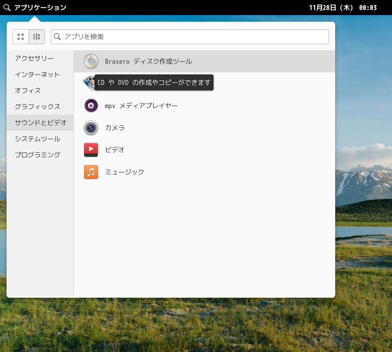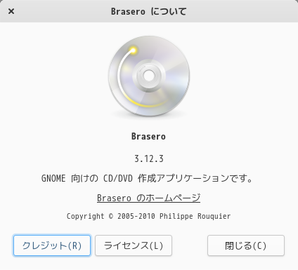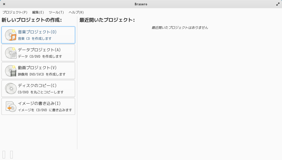 1. 概要 光ディスクライティングソフトとして、「Brasero」を使用します。 2. インストール 「root」ユーザ権限で。 apt install -y brasero 3. 起動 「アプリケーション」→「サウンドとビデオ」→「Brasero」