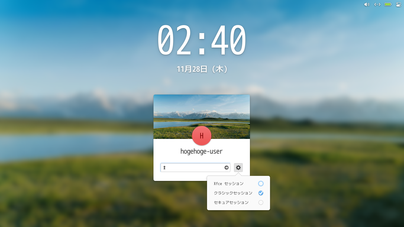 ログイン画面で、ユーザ決定後、右下の設定アイコン「」で、「XFCE セッション」を選択すれば、「XFCE」の環境にログインすることができます。