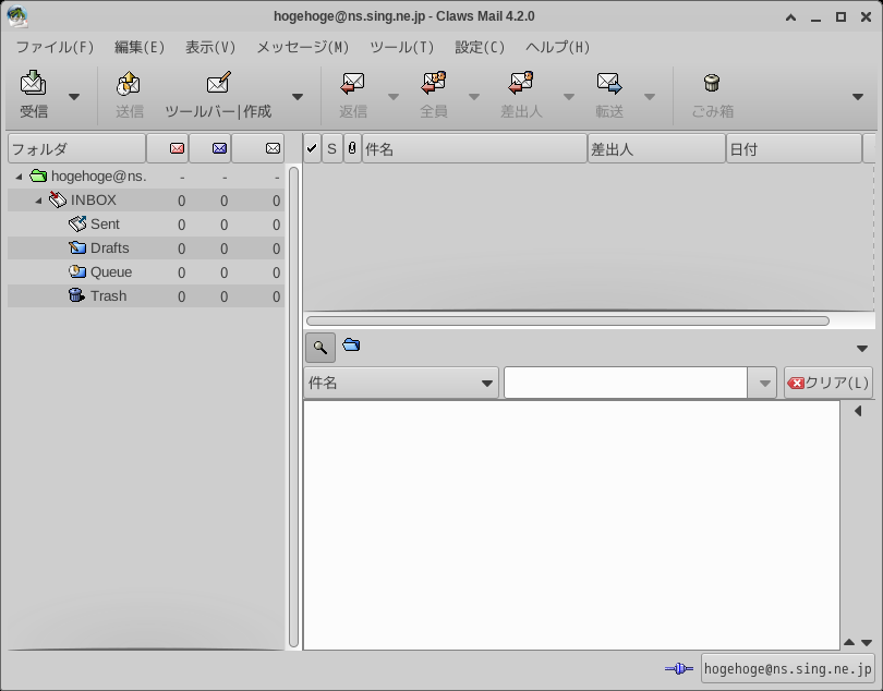 初回起動時は「設定ウィザード」から始まります。 起動直後の状態です。 2024年11月28日の時点で、下記のバージョンでした。 「設定ウィザード」他、操作方法については、「メールクライアント - Claws Mail」をご参照ください。 |