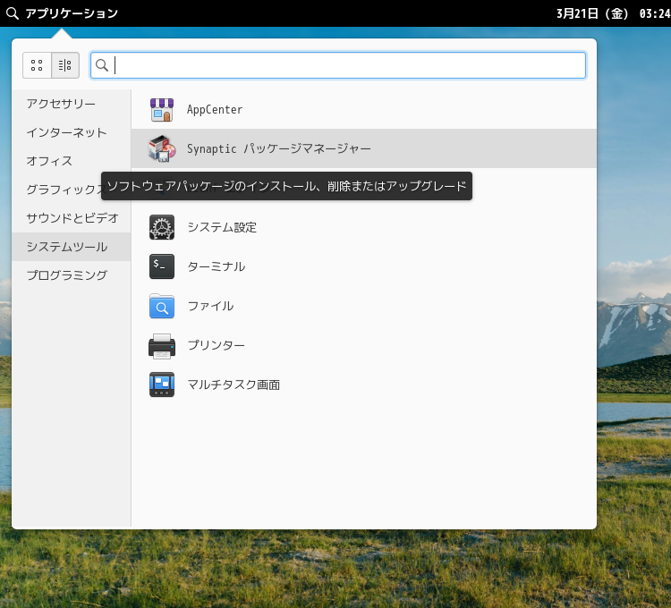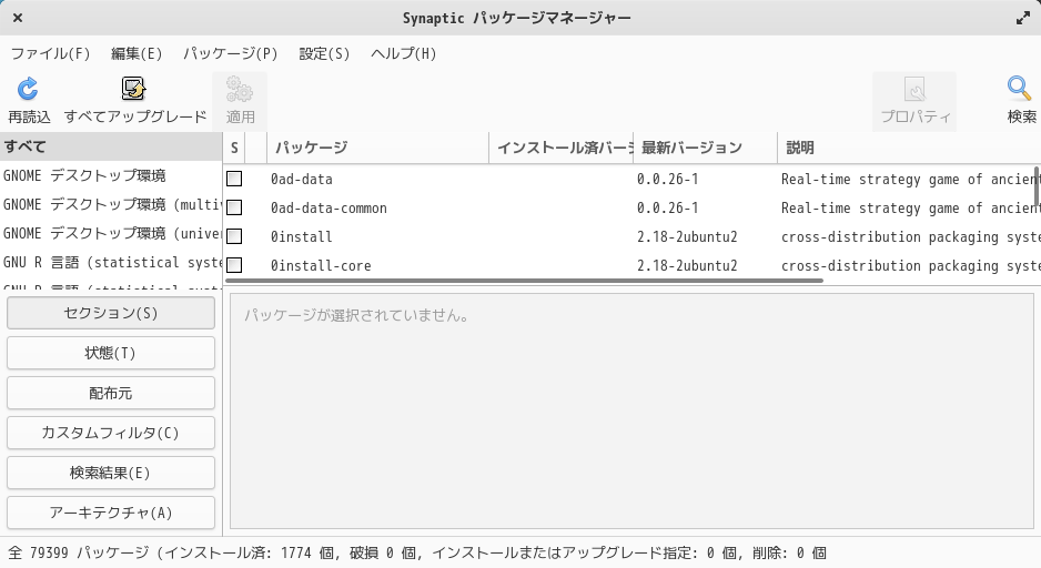 これでは、たりないものがあるので「Synaptic」もインストールして使います。