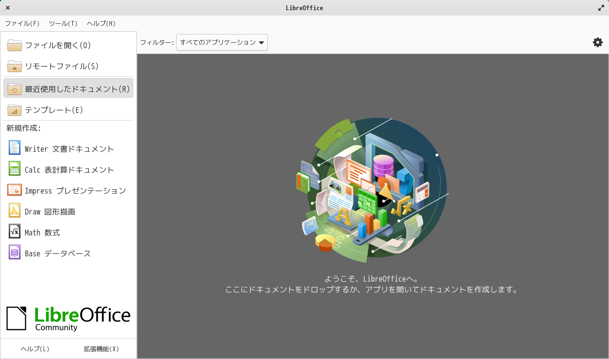 起動直後の状態です。 2025年3月21日の時点で、下記のバージョンでした。 操作方法等については「オフィススィート LibreOffice」をご参照ください。 |