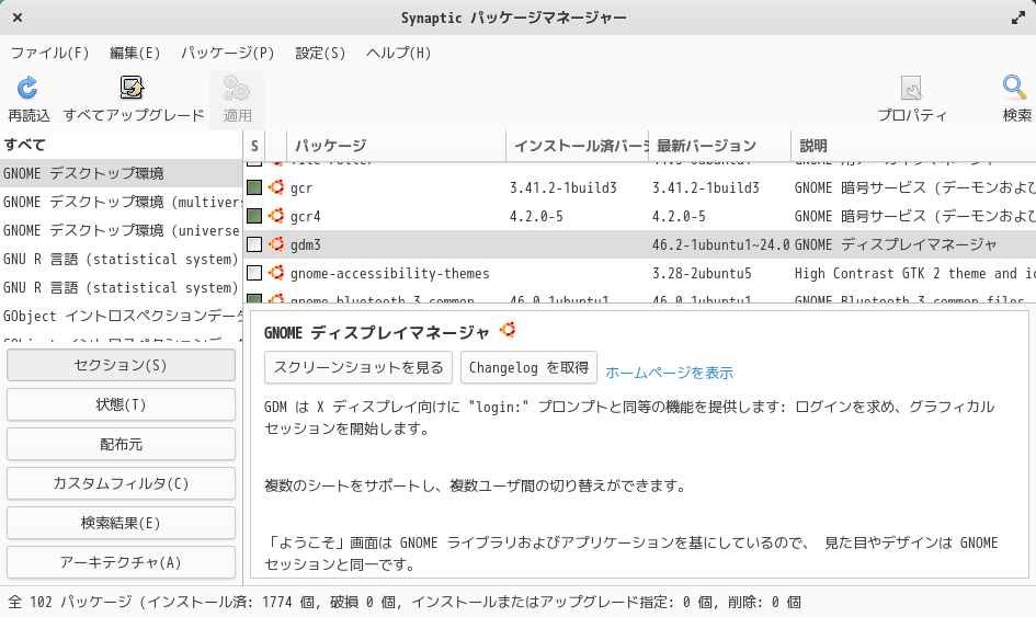 「Synaptic」を起動して「GNOME デスクトップ環境」で、「gdm3」をインストールします。