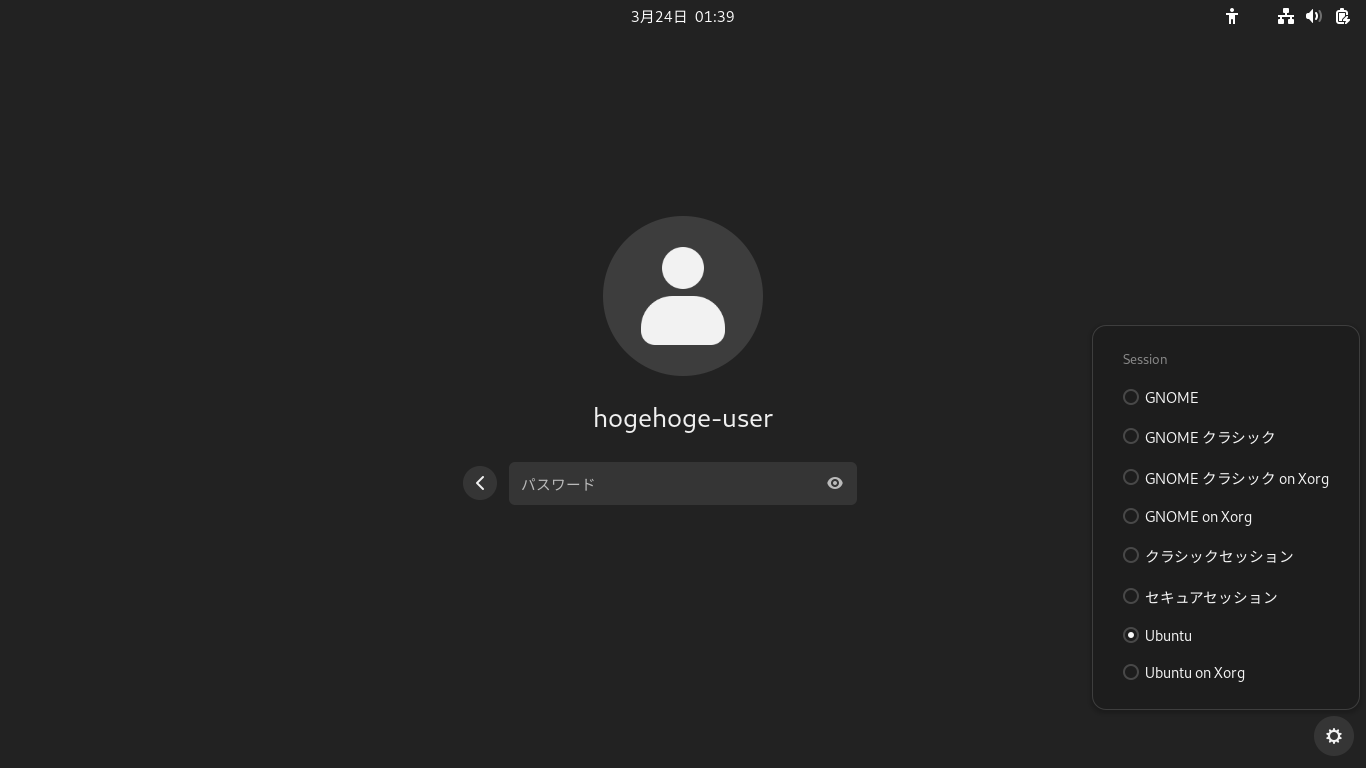 再起動後、ログイン画面で、ユーザ決定後、右下の設定アイコン「」で、「Ubuntu」を選択すれば、「GNOME」の環境にログインすることができます。