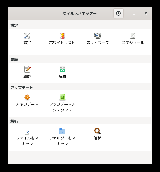 起動直後の状態です。 2025年3月24日の時点で、下記のバージョンでした。 操作については「デスクトップ環境構築 - 共通事項 - アンチウイルスソフト ClamTk」をご参照ください。 |