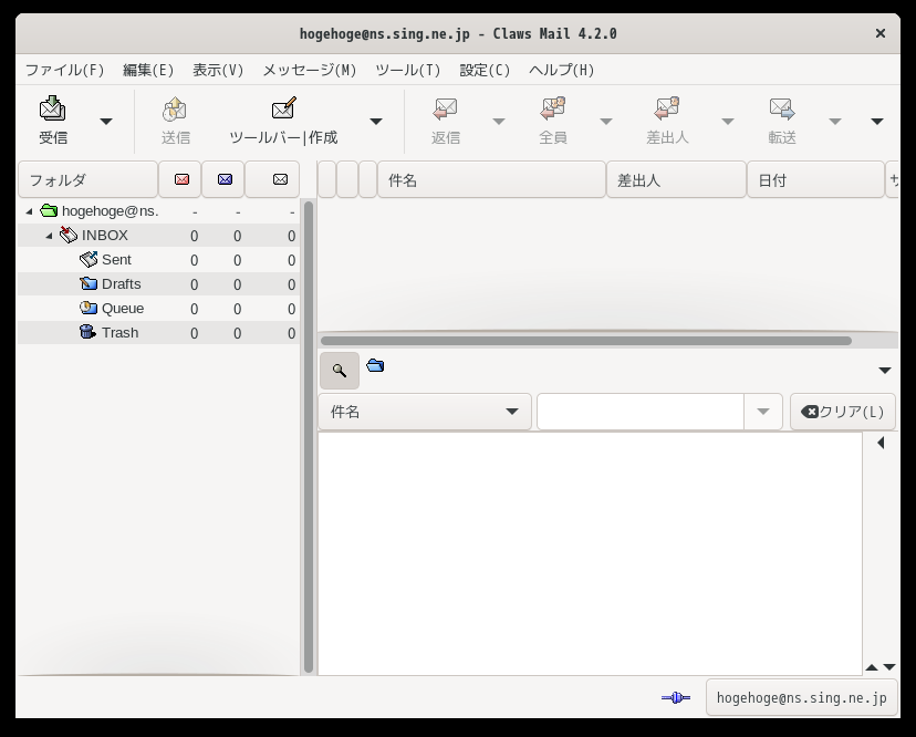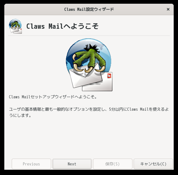 初回起動時は「設定ウィザード」から始まります。 起動直後の状態です。 2025年3月24日の時点で、下記のバージョンでした。 「設定ウィザード」他、操作方法については、「メールクライアント - Claws Mail」をご参照ください。 |