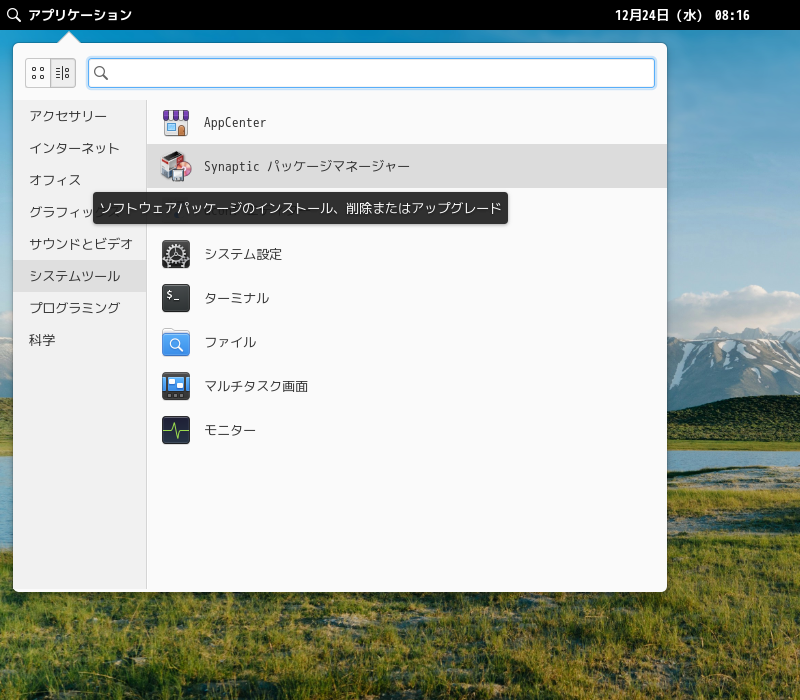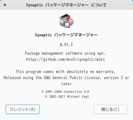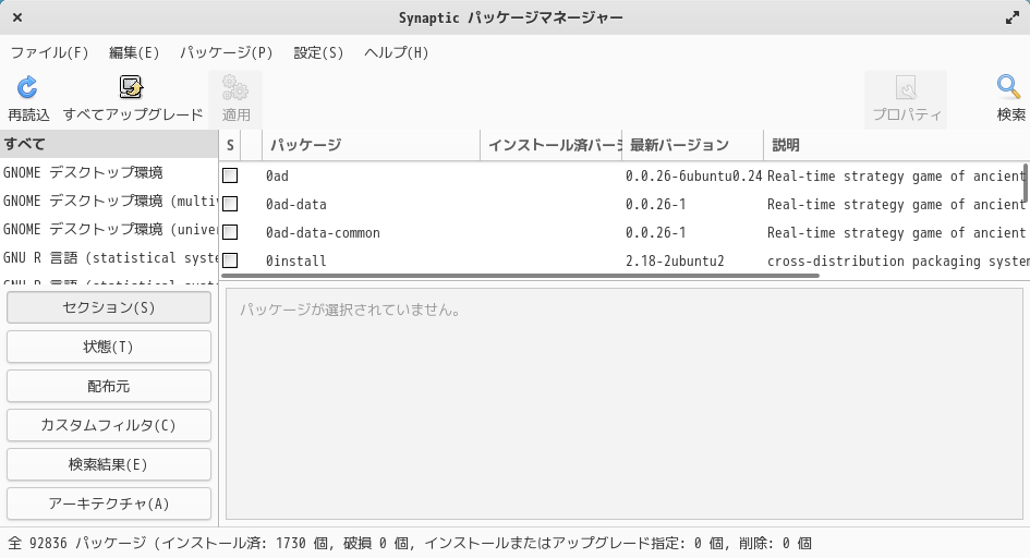 これでは、たりないものがあるので「Synaptic」もインストールして使います。