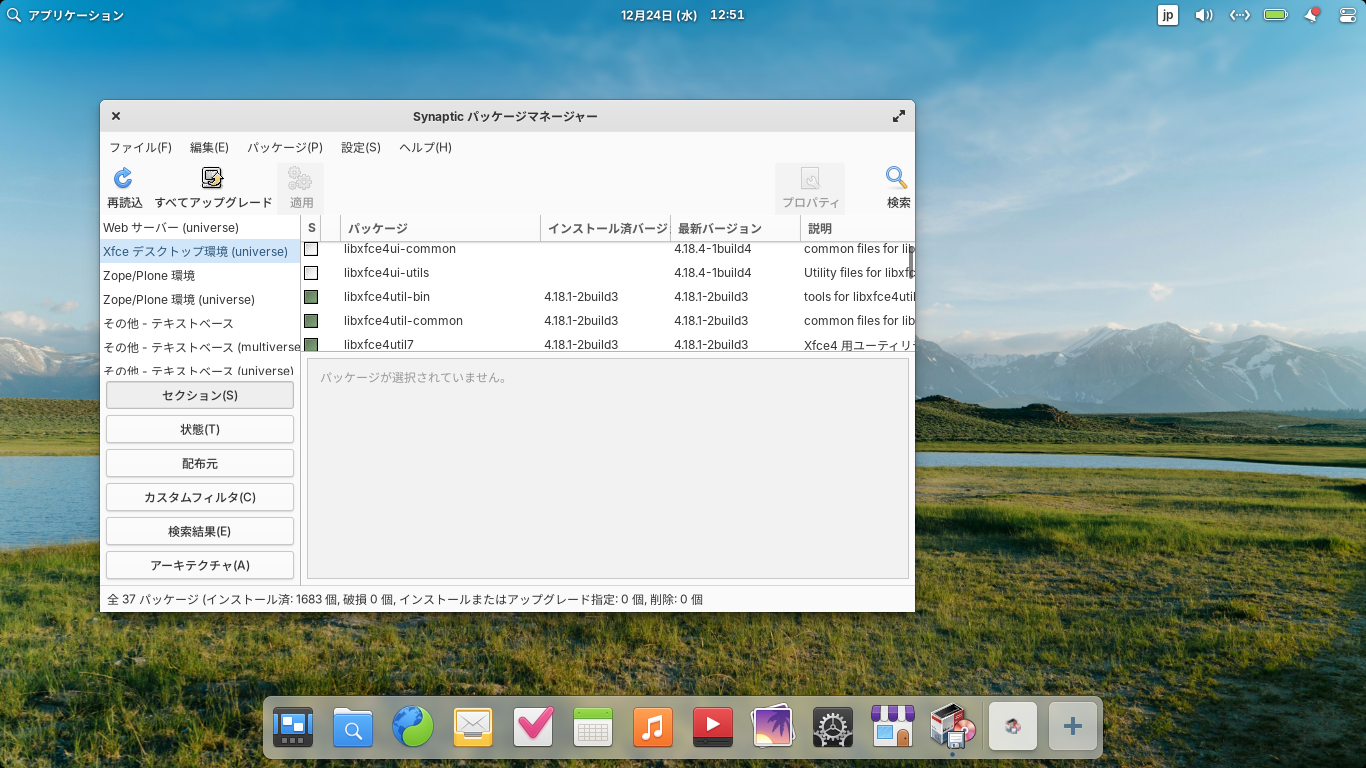 「Synaptic」を起動して「Xfce デスクトップ環境」。