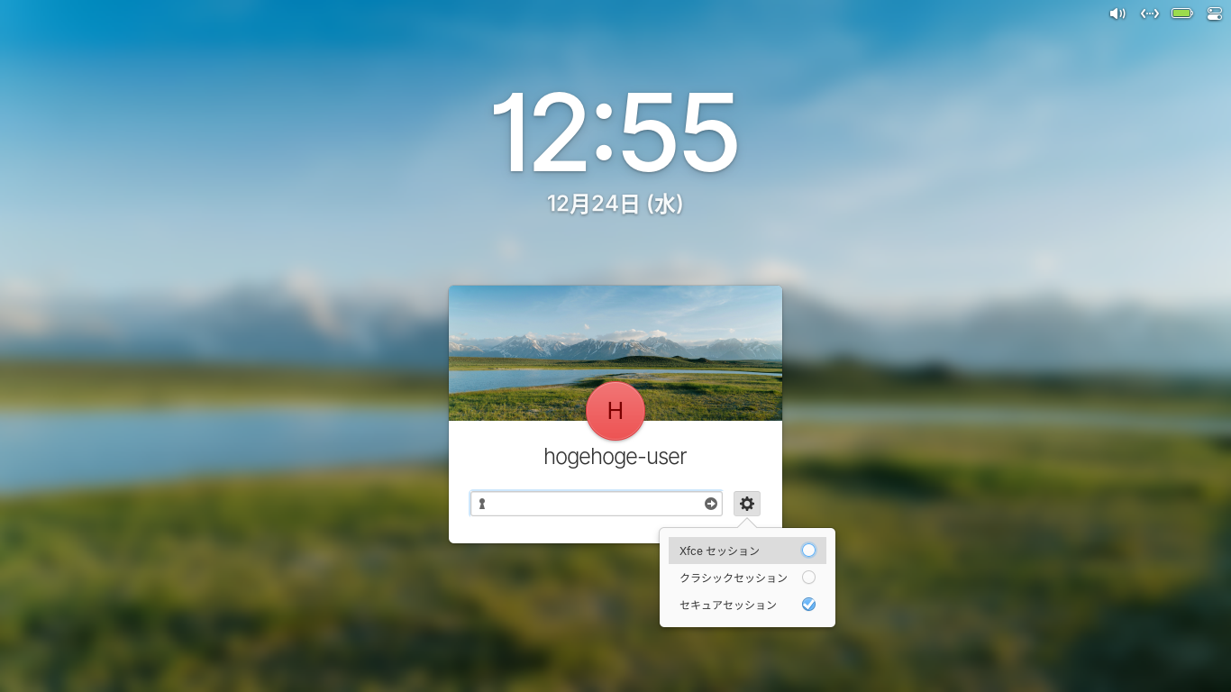 ログイン画面で、ユーザ決定後、右下の設定アイコン「」で、「XFCE セッション」を選択すれば、「XFCE」の環境にログインすることができます。