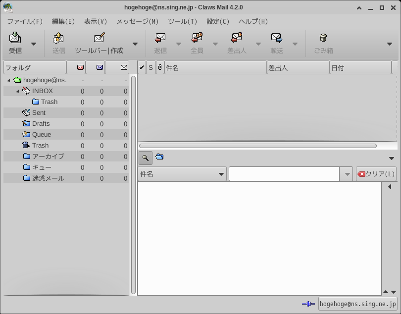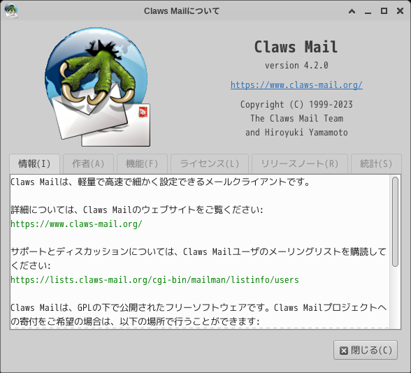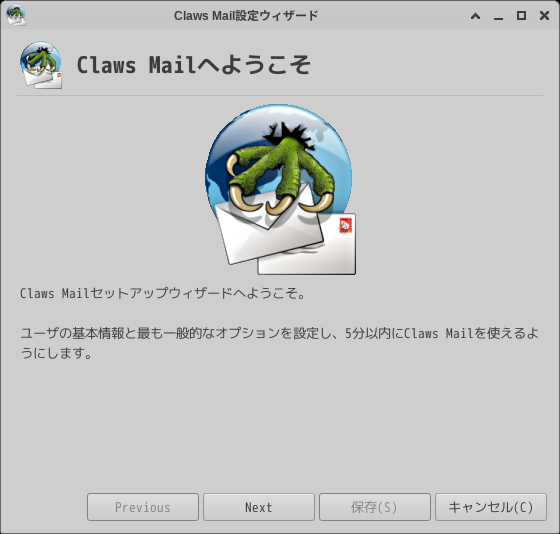 初回起動時は「設定ウィザード」から始まります。 起動直後の状態です。 2025年12月25日の時点で、下記のバージョンでした。 「設定ウィザード」他、操作方法については、「メールクライアント - Claws Mail」をご参照ください。 |