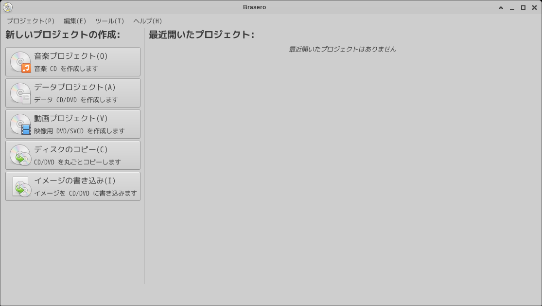 1. 概要 光ディスクライティングソフトとして、「Brasero」を使用します。 2. インストール 「Synaptic」で、「brasero」を検索して、インストールします。 3. 起動 「スタート」→「マルチメディア」→「Brasero」