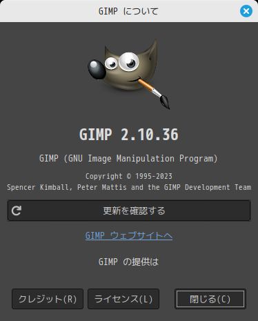 起動直後の状態です。 2024年7月26日の時点で、下記のバージョンでした。 操作については、「画像編集ソフト GIMP2」に掲載しています。 上記は簡単なものですので、詳細なものがほしい方は、各所に初歩の手引きから応用編までありますので、そちらを参考にしてください。 |