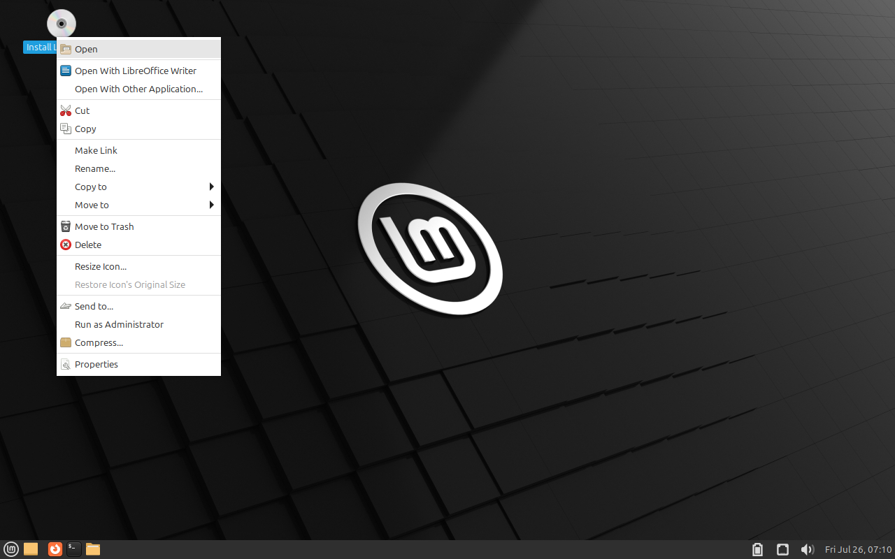 1. インストール インストールについては「Mint - 22 - 共通事項」をご参照ください。 インストール開始時の画面です。 デスクトップ上のインストーラを右クリックして「Open」