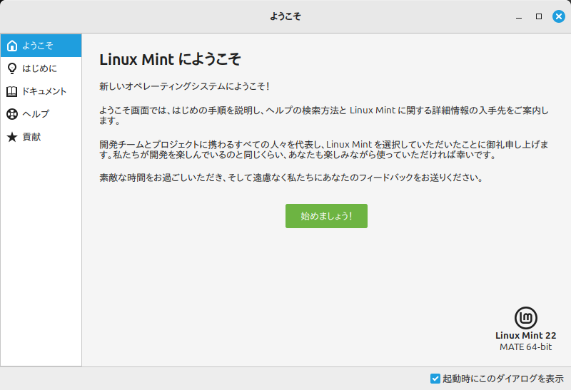 表示しないようにするには「起動時にこのダイアログを表示」のチェックをはずして、閉じます。 表示するには。 「スタート」→「各種設定」→「Welcome スクリーン」 |