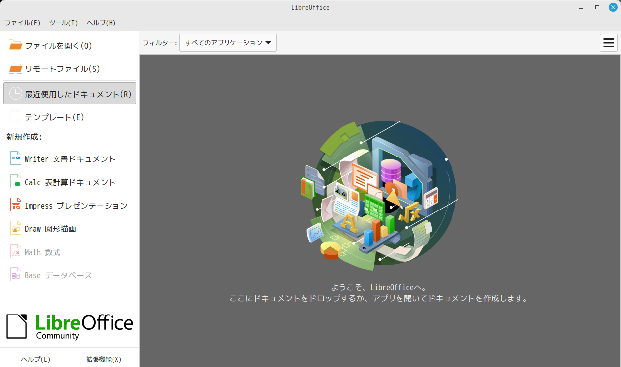 起動直後の状態です。 2024年7月29日の時点で、下記のバージョンでした。 操作方法等については「オフィススィート LibreOffice」をご参照ください。 |
