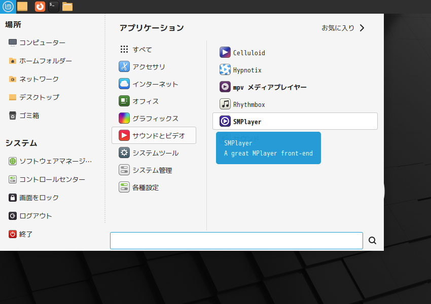 「Synaptic」で、「smplayer」を検索して、インストールします。
