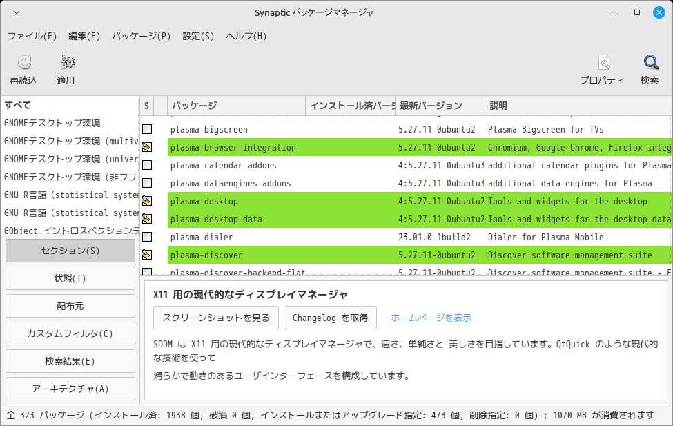 「Synaptic」で「GNOME」「KDE」のデスクトップ環境もインストールできます。