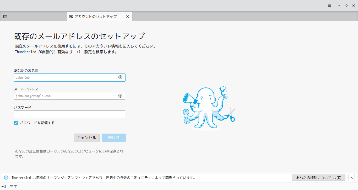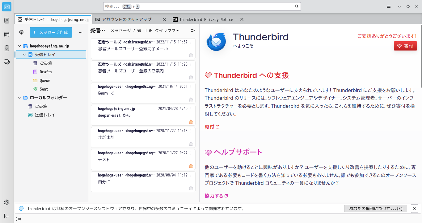 初回起動時は、「メールアカウント セットアップ」からはじまります。 起動直後に、受信トレイを開いた状態です。 202024年7月29日の時点で、下記のバージョンでした。 操作方法の詳細等は「メールクライアント - Thunderbird」でどうぞ。 |