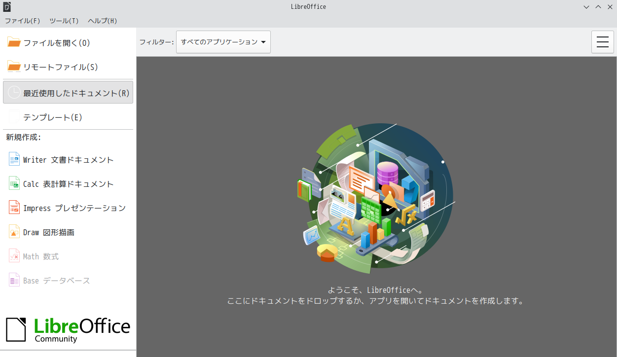 1. 概要 オフィススイートとして「LibreOffice」を使用します。 「LibreOffice」は、デフォルトでインストールされ、日本語化されています。 2. 起動 「スタート」→「オフィス」→「LibreOffice」