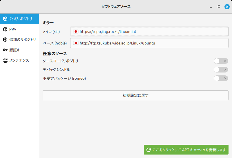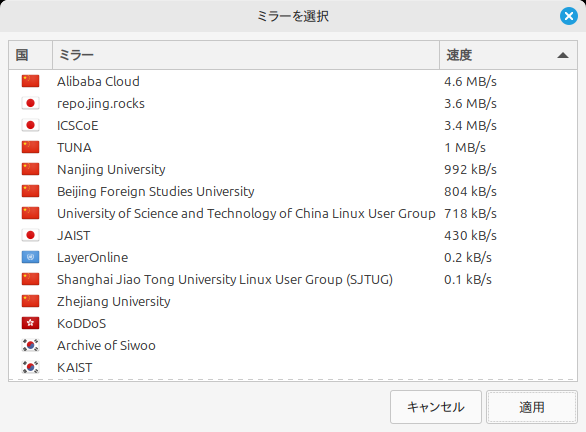 パスワードを入力して 「認証する」 「ベース」をクリック 最も速度の速いミラーを選択して 「適用」 同様に、「メイン」の方も更新します。 その後、「ここをクリックして APT キャッシュを更新します」 更新が終わったら、閉じて、前の画面へ戻ります。 後は、「アップデートを適用」 |