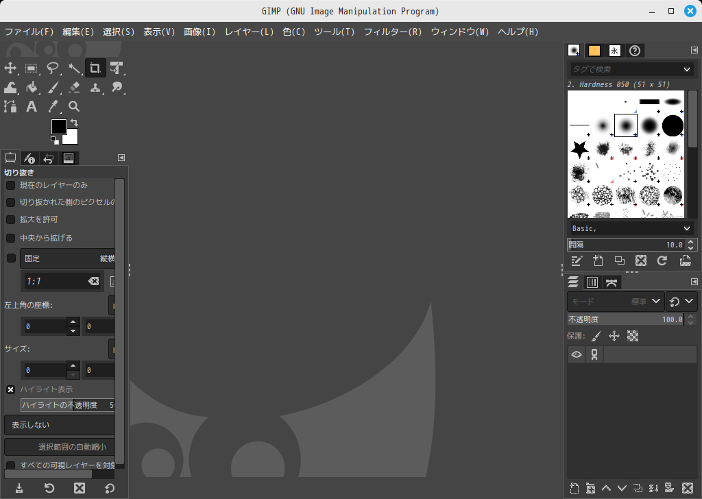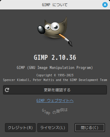 起動直後の状態です。 2025年1月17日の時点で、下記のバージョンでした。 操作については、「画像編集ソフト GIMP2」に掲載しています。 上記は簡単なものですので、詳細なものがほしい方は、各所に初歩の手引きから応用編までありますので、そちらを参考にしてください。 |