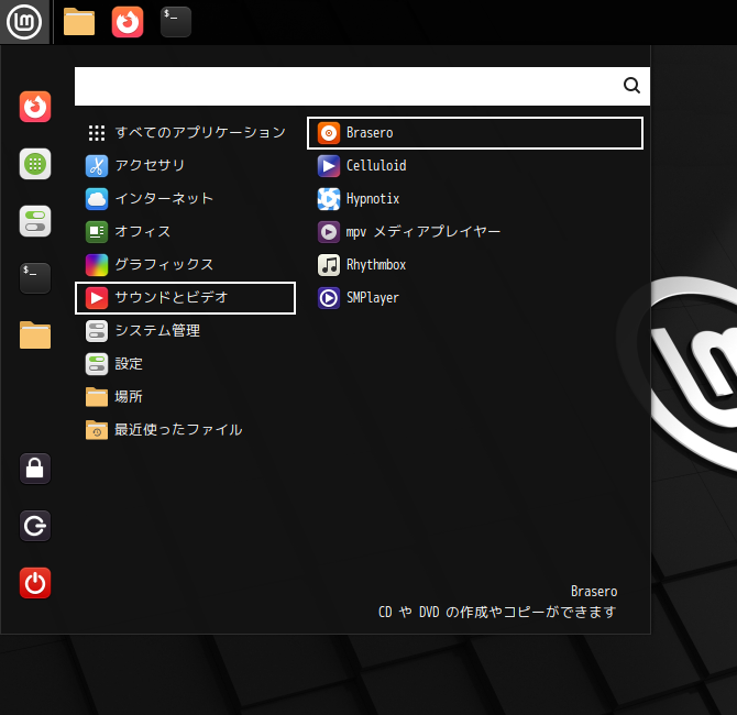 1. 概要 光ディスクライティングソフトとして、「Brasero」を使用します。 2. インストール 「Synaptic」で、「brasero」を検索して、インストールします。 3. 起動 「スタート」→「サウンドとビデオ」→「Brasero」