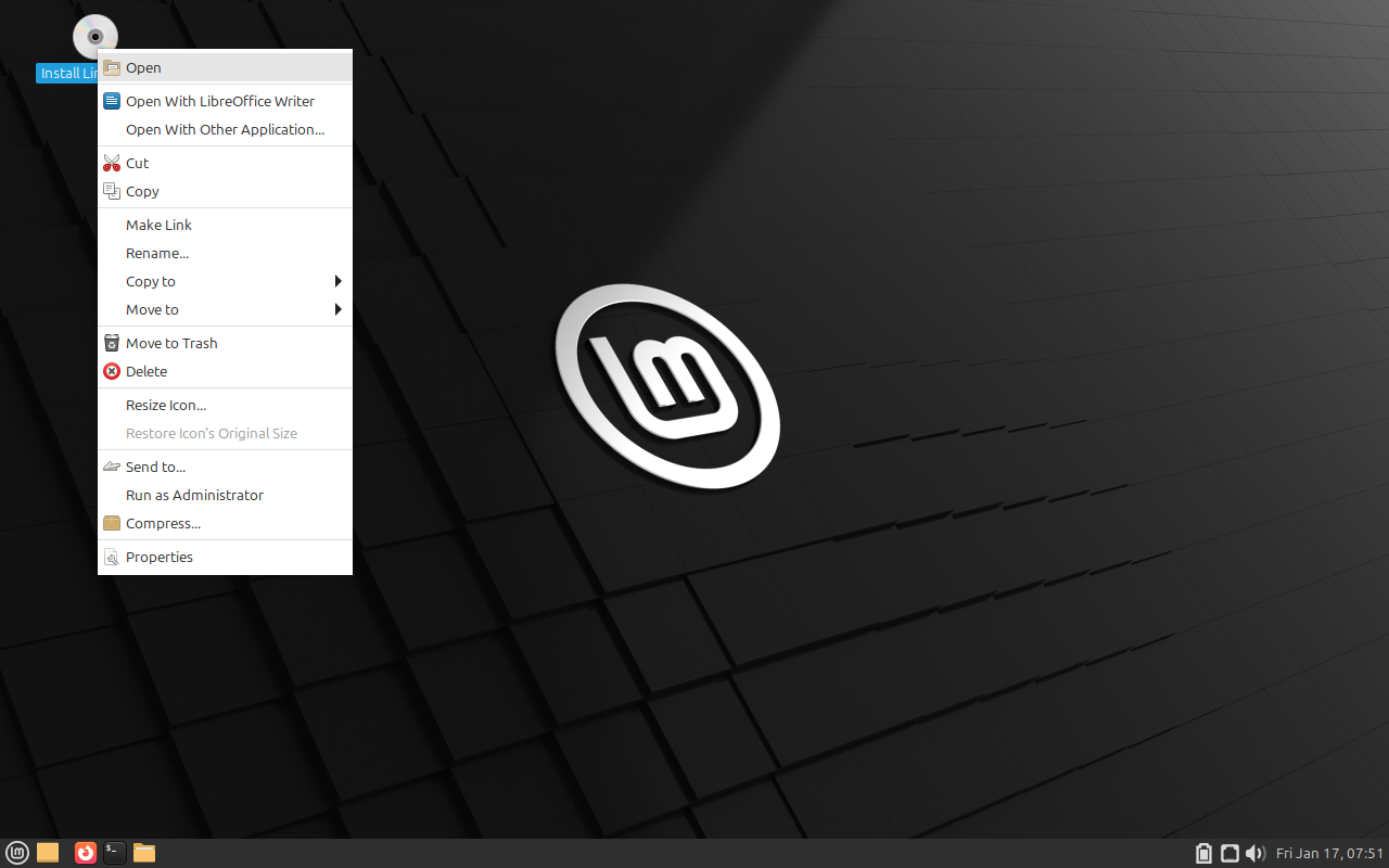 1. インストール インストールについては「Mint - 22.1 - 共通事項」をご参照ください。 インストール開始時の画面です。 デスクトップ上のインストーラを右クリックして「Open」