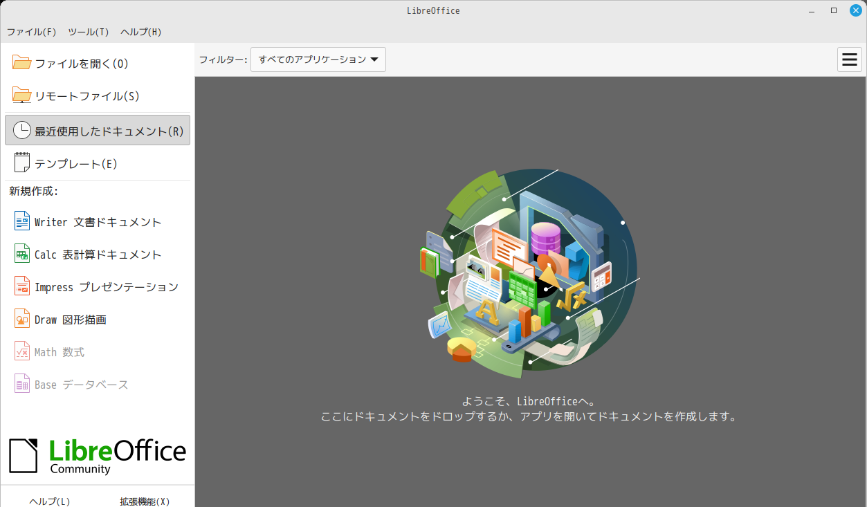 起動直後の状態です。 2025年1月20日の時点で、下記のバージョンでした。 操作方法等については「オフィススィート LibreOffice」をご参照ください。 |
