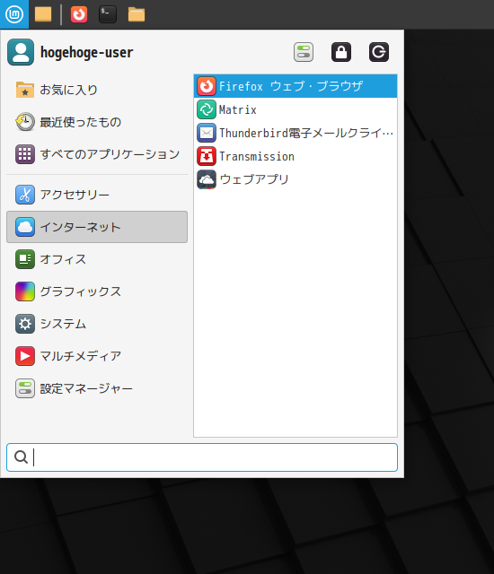 1. 概要 ブラウザとして、「Firefox」がデフォルトでインストールされています。 日本語化されていますので、「Firefox」をそのまま使用します。 2. 起動 「スタート」→「インターネット」→「Firefox」