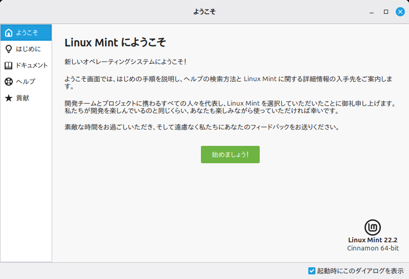 表示しないようにするには「起動時にこのダイアログを表示」のチェックをはずして、閉じます。