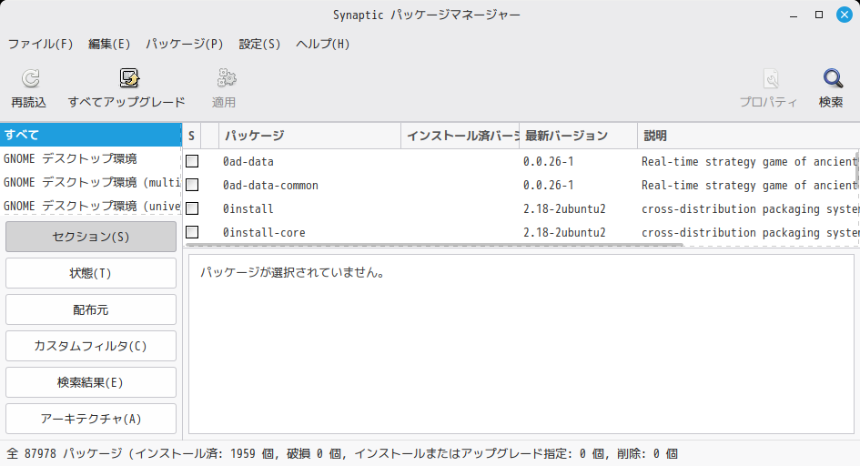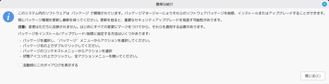 起動直後の状態です。 2025年9月5日の時点で、下記のバージョンでした。 ここで、「Synaptic」をインストールします。 パスワードを入力して 「認証」 初回起動時は巨大なダイアログが表示されます。 起動直後の状態です。 2025年9月5日の時点で、下記のバージョンでした。 |