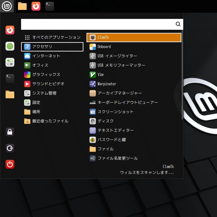 1. 概要 「ClamTk」は、「GUI」で操作するアンチウィルスソフトです。 2. インストール 「Synaptic」で、「clamtk」を検索して、インストールします。 3. 起動 「スタート」→「アクセサリ」→「ClamTk」
