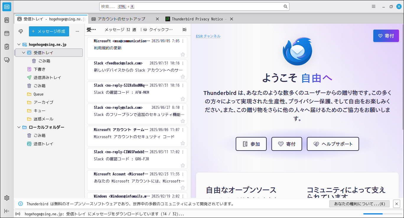 初回起動時は、「メールアカウント セットアップ」からはじまります。 起動直後に、受信トレイを開いた状態です。 2025年9月9日の時点で、下記のバージョンでした。 操作方法の詳細等は「メールクライアント - Thunderbird」でどうぞ。 |