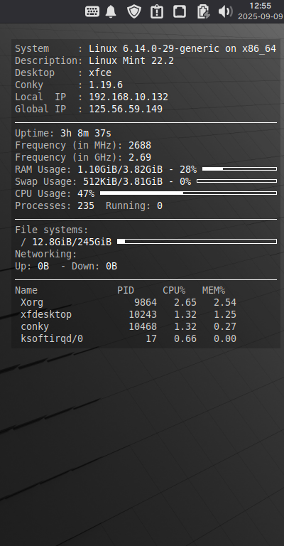ログイン後に、デスクトップ右に、「Conky」の表示が現れます。