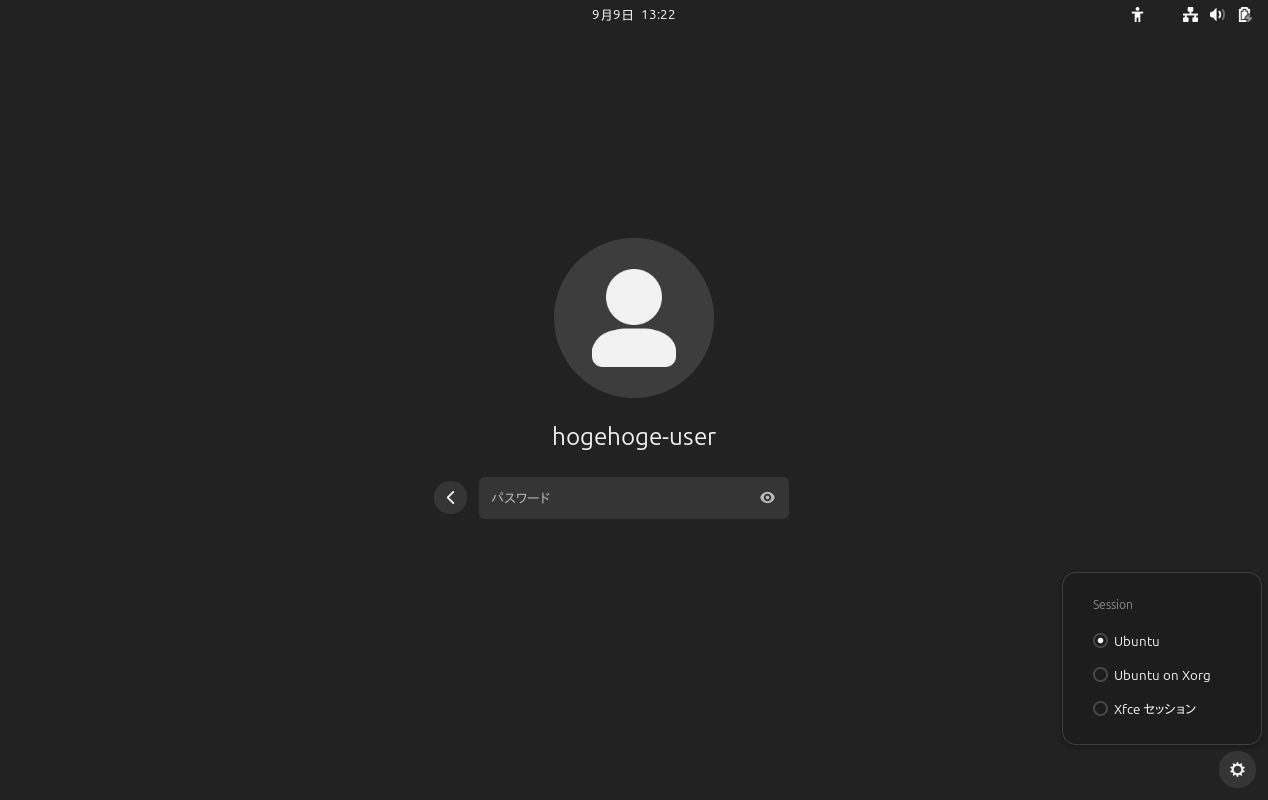 右下の設定アイコン「」で「Ubuntu」を選択してログインします。