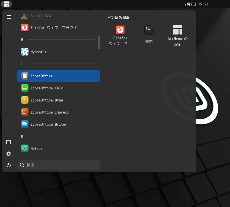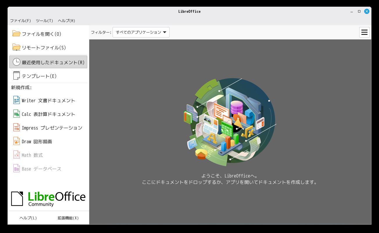 1. 概要 オフィススイートとして「LibreOffice」を使用します。 「LibreOffice」は、デフォルトでインストールされ、日本語化されています。 2. 起動 「スタート」→「L」→「LibreOffice」