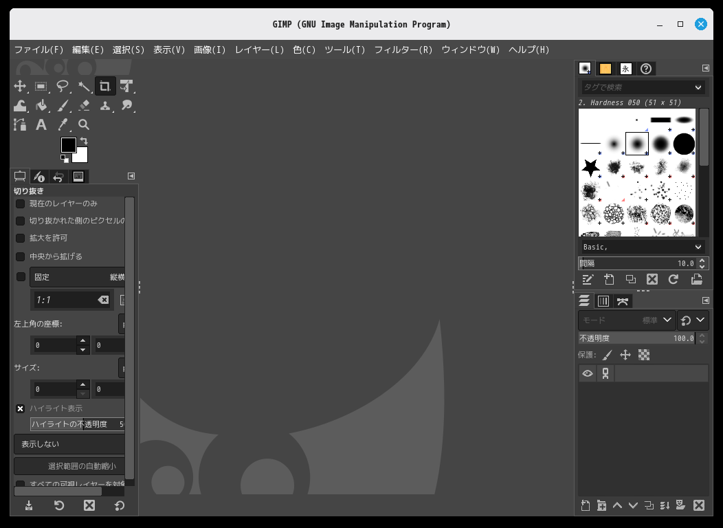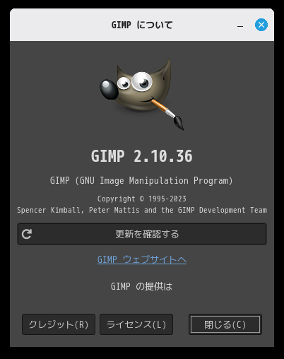 起動直後の状態です。 2025年9月9日の時点で、下記のバージョンでした。 操作については、「画像編集ソフト GIMP」に掲載しています。 上記は簡単なものですので、詳細なものがほしい方は、各所に初歩の手引きから応用編までありますので、そちらを参考にしてください。 |