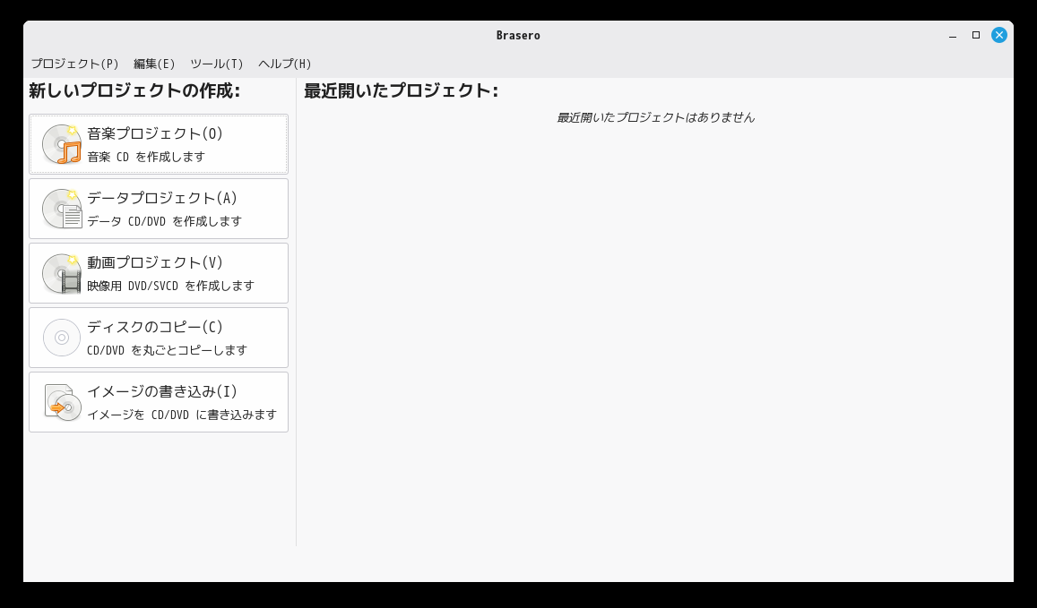 1. 概要 光ディスクライティングソフトとして、「Brasero」を使用します。 2. インストール 「Synaptic」で、「brasero」を検索して、インストールできます。 3. 起動 「スタート」→「B」→「Brasero」