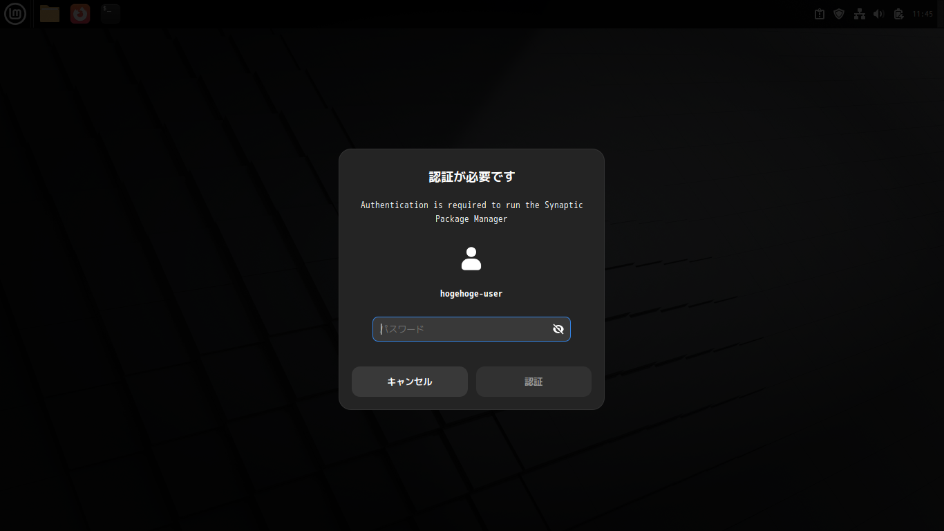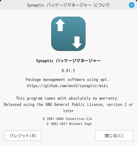 起動直後の状態です。 2026年1月14日の時点で、下記のバージョンでした。 ここで、「Synaptic」をインストールします。 パスワードを入力して 「認証」 初回起動時は巨大なダイアログが表示されます。 起動直後の状態です。 2026年1月14日の時点で、下記のバージョンでした。 |