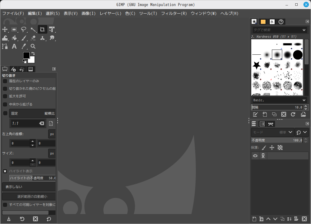 起動直後の状態です。 2026年1月15日の時点で、下記のバージョンでした。 操作については、「画像編集ソフト - GIMP」に掲載しています。 上記は簡単なものですので、詳細なものがほしい方は、各所に初歩の手引きから応用編までありますので、そちらを参考にしてください。 |