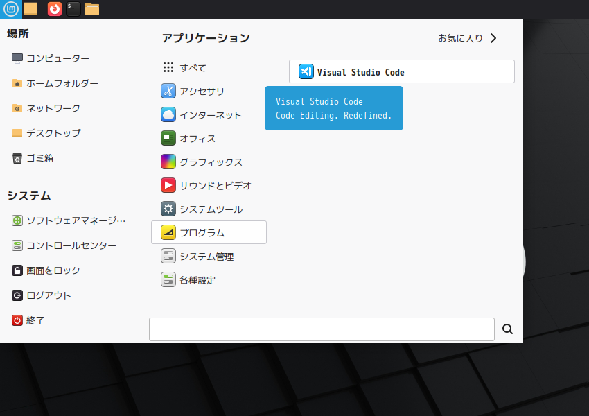 「スタート」→「プログラミング」→「Visual Studio Code」