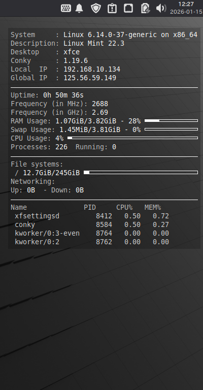 ログイン後に、デスクトップ右に、「Conky」の表示が現れます。