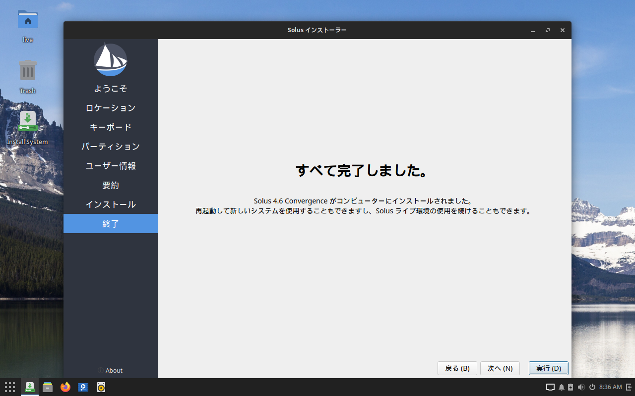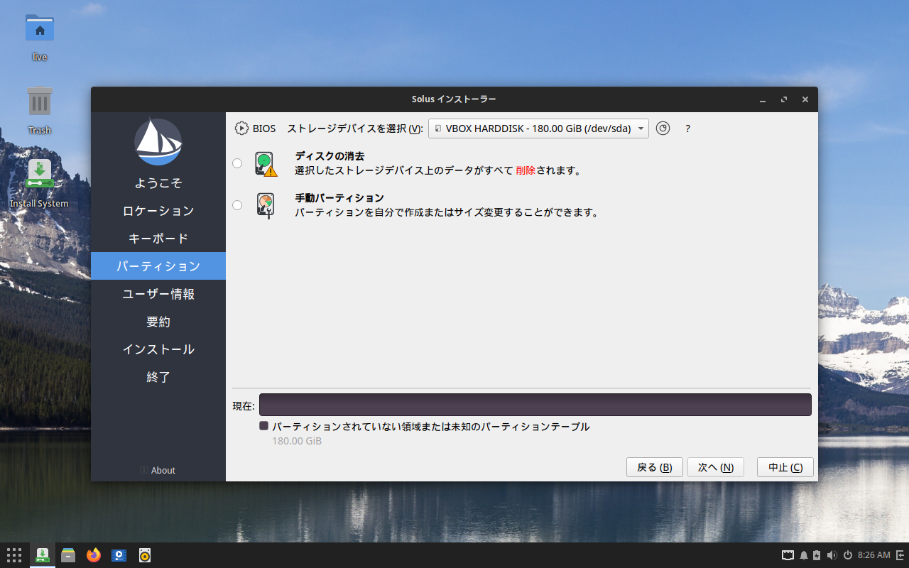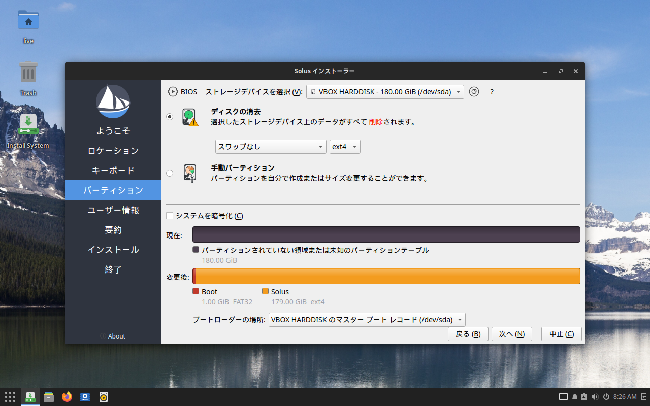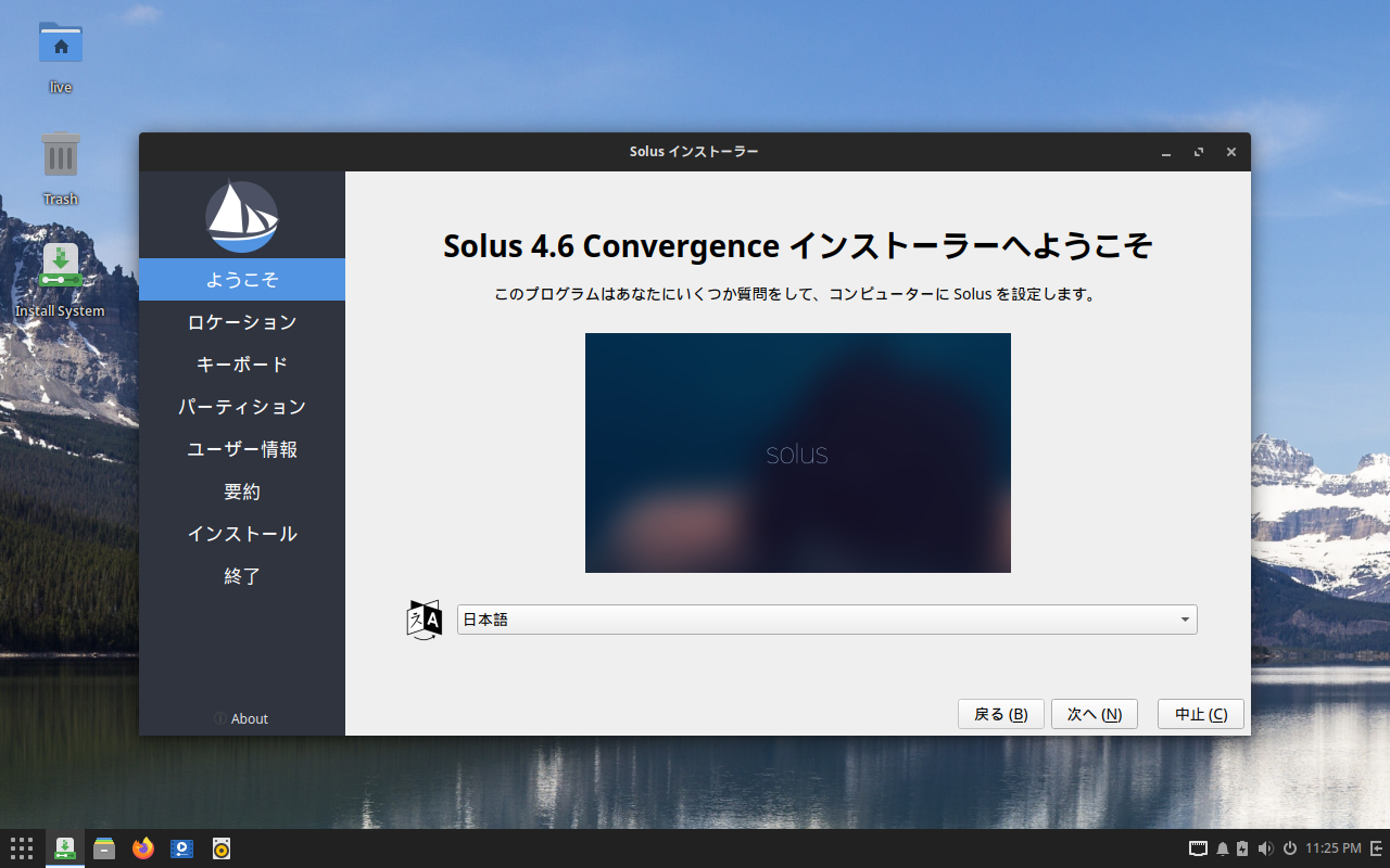 以下は、「Solus 4.6 BUDGIE」を「VirtualBox 7.1.2」上にインストールしたものです。