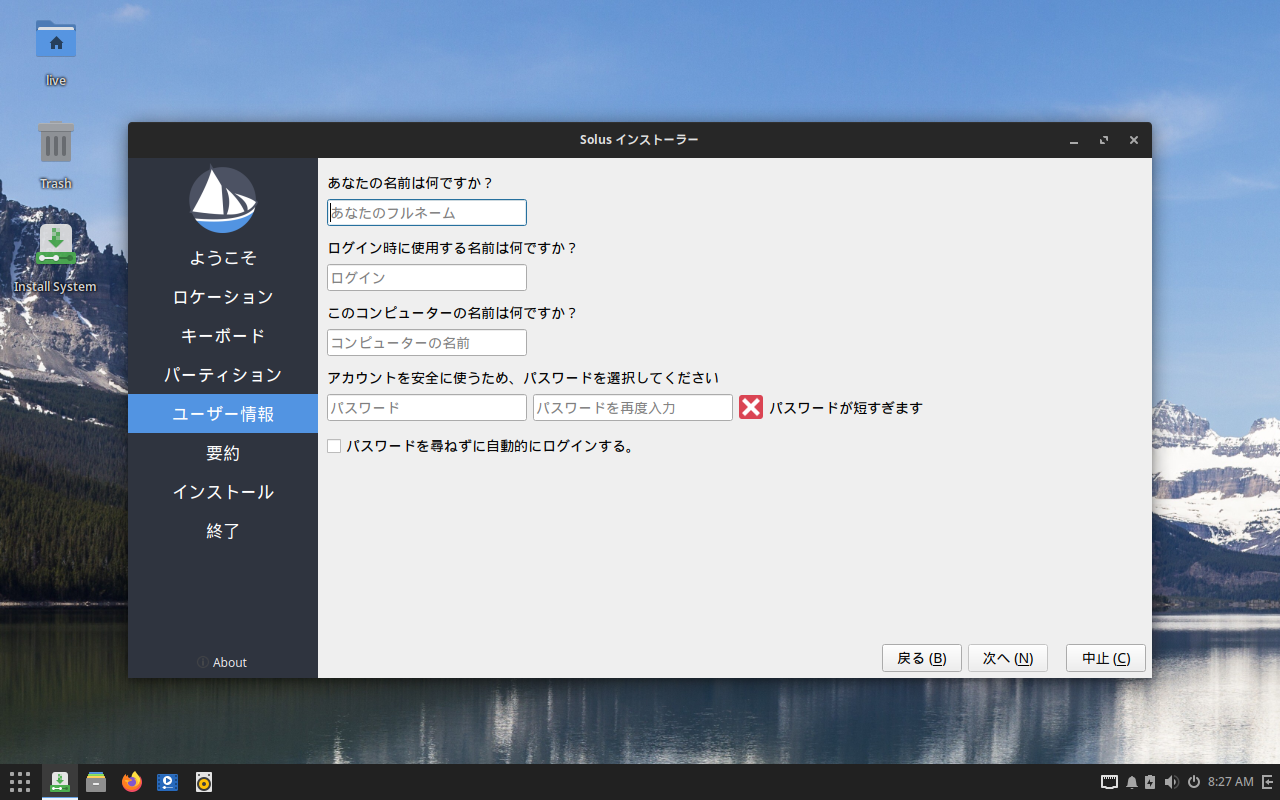 (他の多くのディストリビューションと異なって、上がログイン名、下がフルネームですので間違えないように)