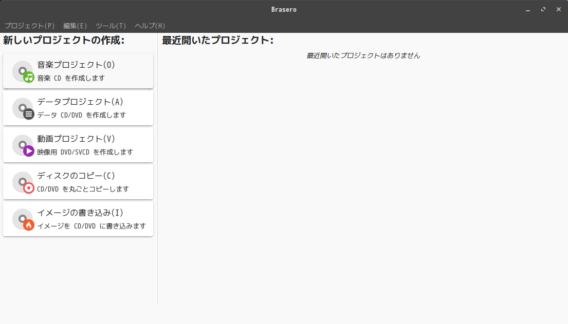 1. 概要 光ディスクライティングソフトとして、「Brasero」を使用します。 2. インストール 「ソフトウェアセンター(solus-sc)」で、「brasero」で検索してインストールします。 3. 起動 「スタート」→「Sound & Video」→「Brasero」
