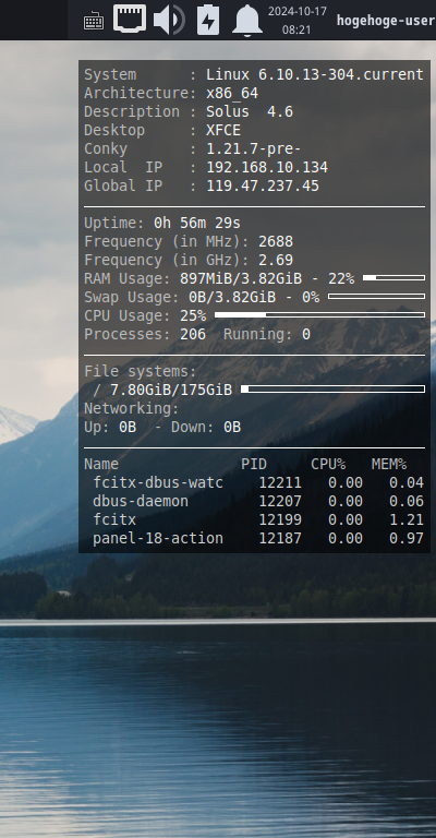 再ログイン後、デスクトップ右に、「Conky」の表示が現れます。