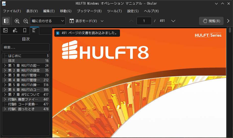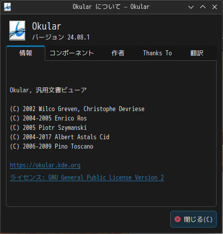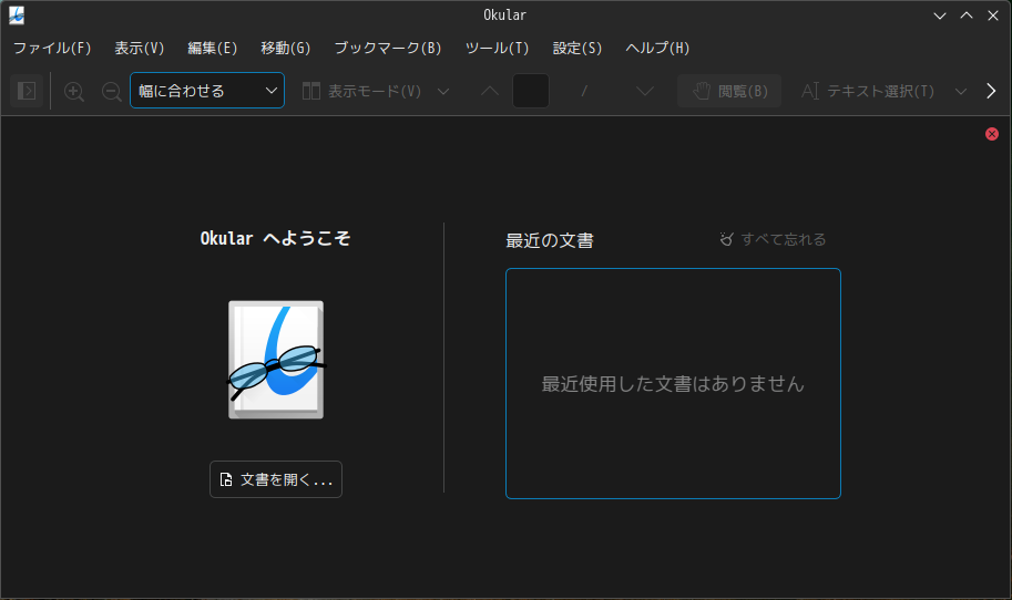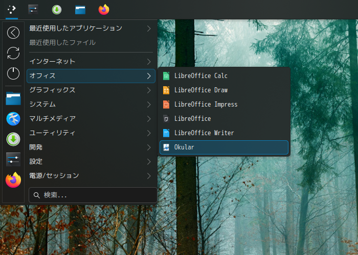 1. 概要 ドキュメントビューアとして、「Okular」を使用します。 「Okular」は、デフォルトでインストールされています。 2. 起動 「スタート」→「オフィス」→「Okular」
